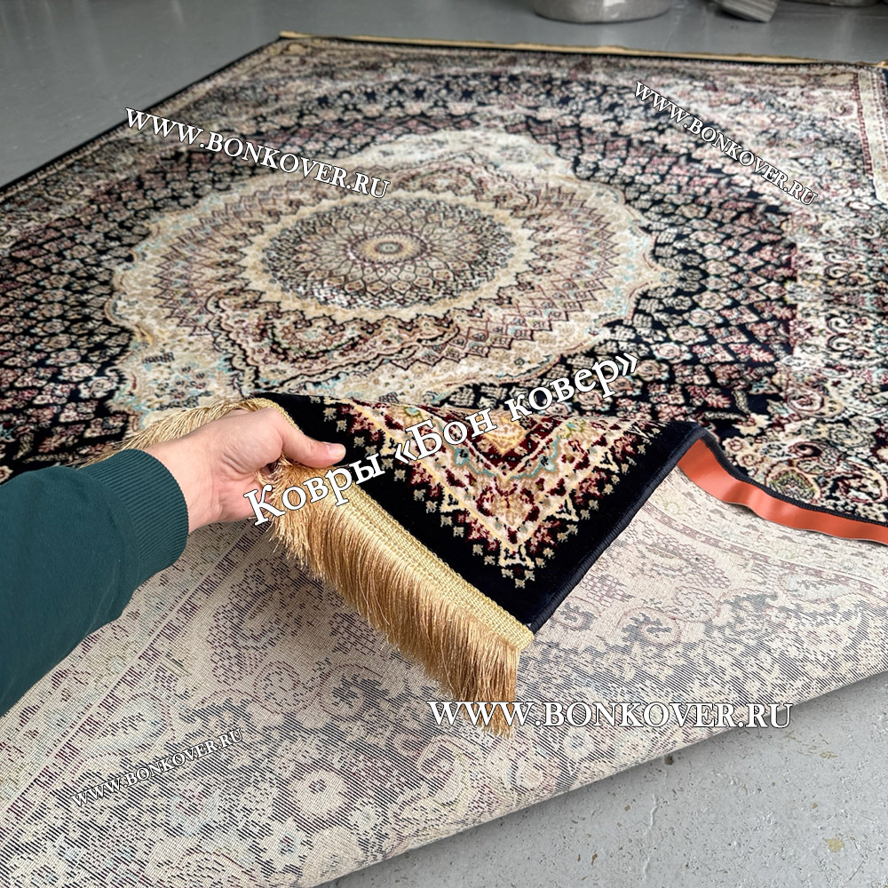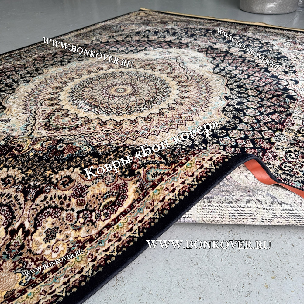 Долго искали смотрели на разных сайтах , в итоге ваш ковер приглянулся больше всего . Доставили в рулоне на следующий день , оплатили при получении . Идеальный вариант , цвет темно синий с переливом - рисунок очень выйгрышно смотрится !